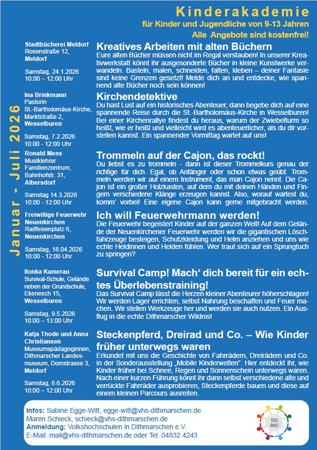 KINDERAKADEMIEBald erscheint hier das neue Programm der Kinderakademie.Seid gespannt! KINDERAKADEMIEWir haben wieder ein spannendes Programm für Kinder und Jugendliche im Alter von 9 bis 13 Jahren vorbereitet.Seid dabei, wir freuen uns auf euch! Hier könnt ihr den aktuellen Flyer der Kinderakademie herunterladen.